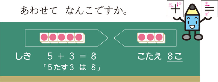 名数による式「5匹+3匹」のことを名数式,「5+3」のように名数によらない式のことを無名数式といいます。